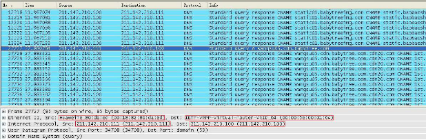 发现内网数据中99%以上都是211.142.210.100为源地址发出的DNS响应报文,而目的地址基本有两个211.142.210.96和211.142.210.111,是211.142.210.100这个DNS服务器所在网段的网络地址和广播地址。此时怀疑是211.142.210.100这台服务器中了病毒,发送大量的攻击报文。但经检查,排除了这个原因。既然不是内网的问题,则可能是外网的攻击导致。