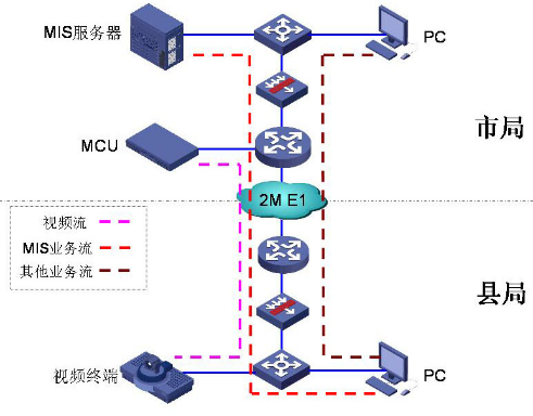 XX区县到地州的线路为4M,根据业务要求,使用基于类的队列(CBQ)进行拥塞管理,给予MIS系统较高优先级,标记为af31数据流,当网络发生拥塞时保障至少1.5M的带宽。视频会议系统给予同样优先级,标记为af41数据流,进行确保转发,保证2M带宽。其他数据分配较低优先级,在线路拥塞时预留0.5M带宽。当网络中只有MIS系统和其他业务数据流且发生拥塞时,保障MIS系统有3M的带宽,并给其他业务保留1M带宽。网络未发生拥塞时,设备对各数据流进行尽力转发,先到的数据流优先转发。拓扑结构及数据流如下图: