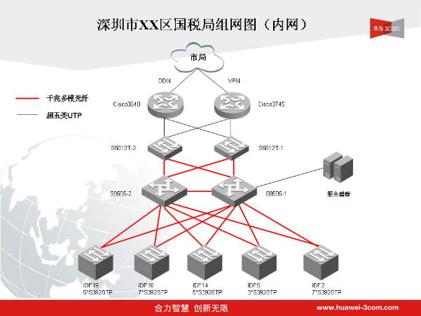 高安全:通过内外网物理隔离、选择安全的网络设备、安全的拓扑结构以及丰富的用户安全管理,最大程度的建设XX国税安全网络。