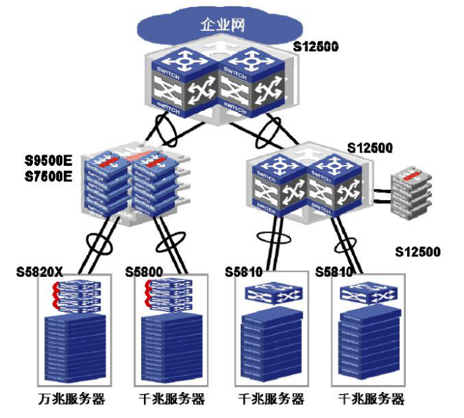 H3C采用基于100G平台的S12500系列交换机作为数据中心核心,汇聚层可以采用S12500或S9500E/S7500E产品,通过集成的防火墙、负载均衡等多业务板卡来实现安全保证和流量均衡。接入层S58系列可以提供高密度的千兆或万兆等丰富的服务器接入方案。